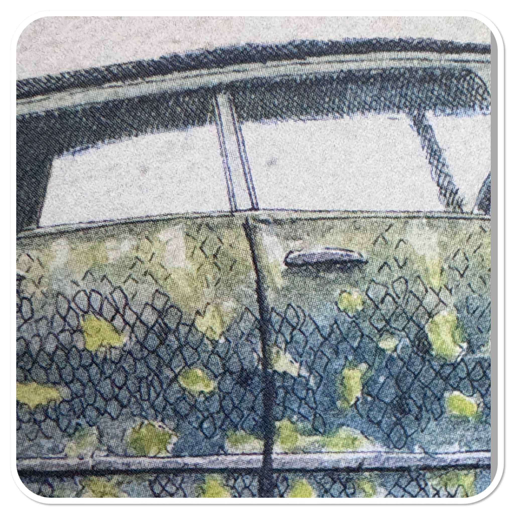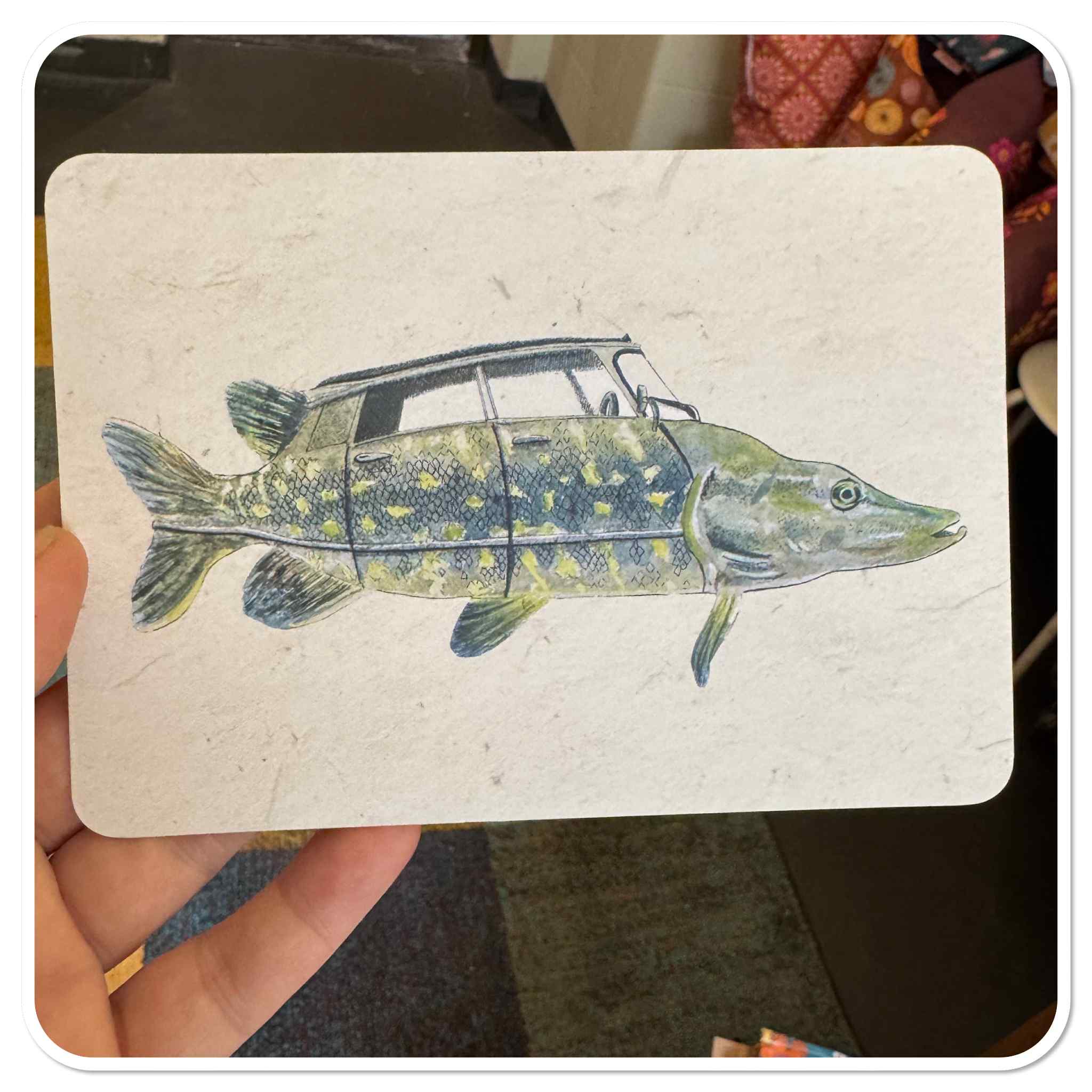 Over de Illustratie: Ellenstyll’s illustraties staan bekend om hun speelse twist op actuele thema’s, zoals klimaatverandering en dieren in onverwachte en vreemde situaties. Deze is toch wel de winnaar ( tot nu toe). Een visauto! een snoek! hee dat is toch een auto? Veel reacties als mensen de kaart zien.