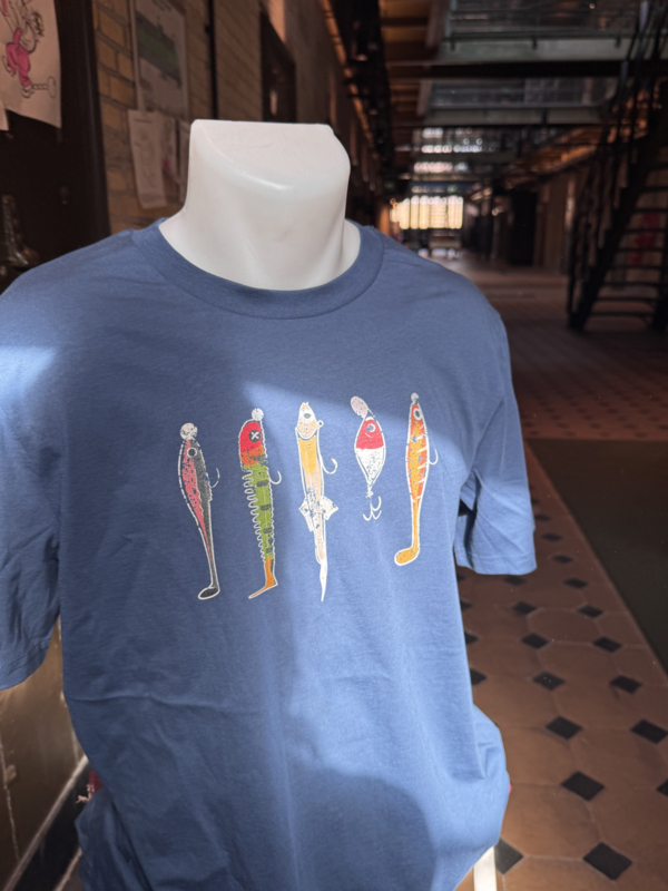 Prachtig shirt met een illustratie van een aantal vispluggen. Geen gladde print, je ziet de structuur van de stof nog door de inkt. De print is gedrukt via DTG print technologie. De uitleg over deze techniek staat verderop in de tekst.