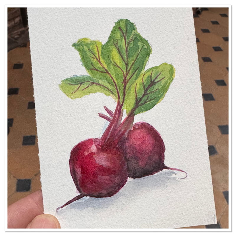Hoe leuk! Een prachtige aquarel van rode bieten in een lijstje. De aquarel is 15 cm bij 10 cm groot