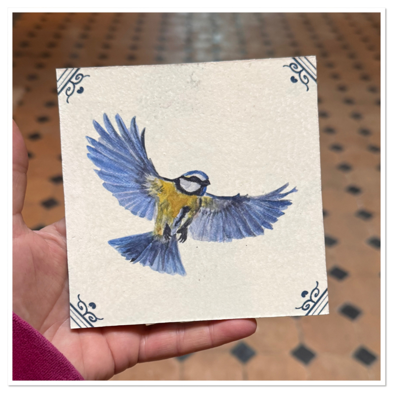 Op deze tegel zie je een pimpelmees. de illustratie is door Ellen geschilderd met aquarelverf en als reproductie op dit tegeltje gedrukt.