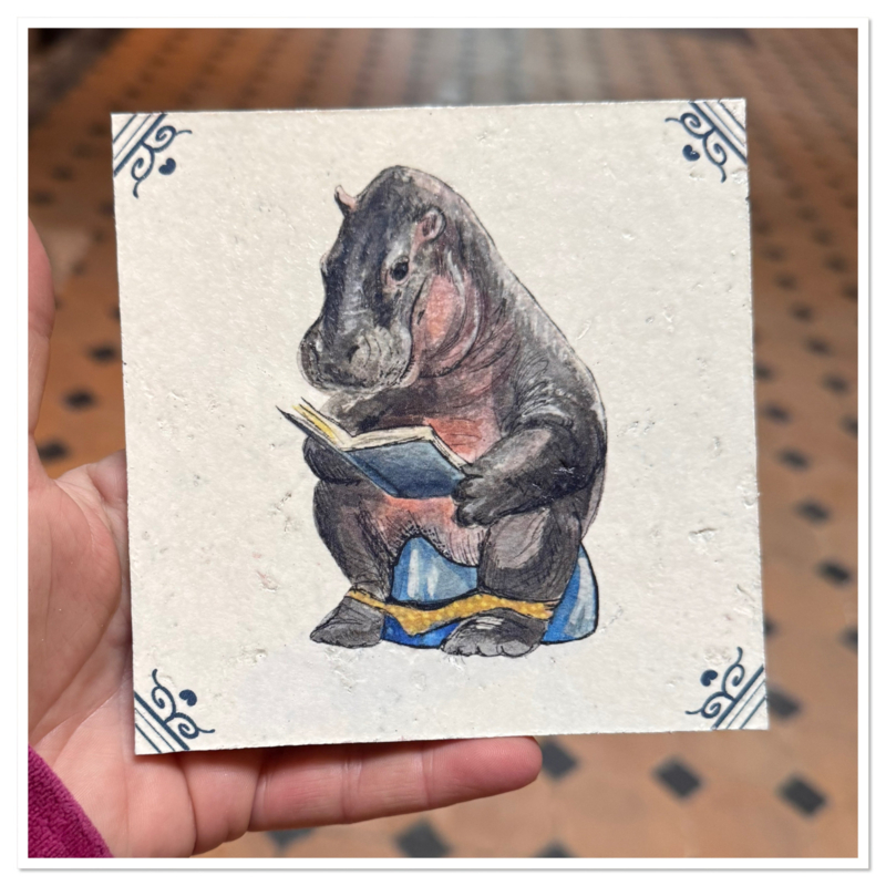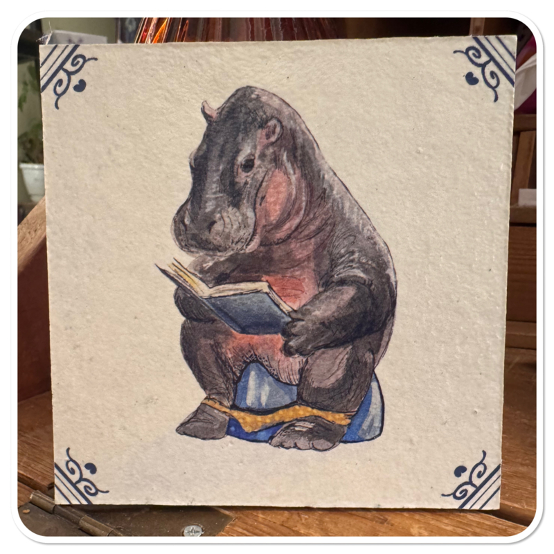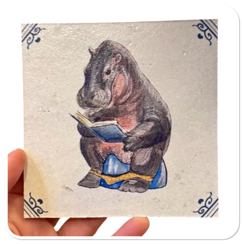Op deze tegel zie je een Hippo, een Nijlpaard op een potje. met de broek op de enkels en een boek in de handen. Een hit voor op de kinderkamer, of voor mensen die van woordgrappen houden. de illustratie is door Ellen geschilderd met aquarelverf en als reproductie op dit tegeltje gedrukt.