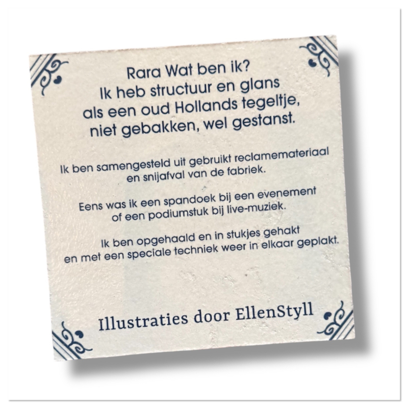 Dit toffe tegeltje, met zijn grove structuur en glans, laat je even twee keer kijken, want het is niet gebakken, maar het is geperst. En die geperste plaat is vervolgens bedrukt en in tegels van 13 bij 13 cm gesneden. De structuur en de glans geeft je echt dat oud Hollands tegeltje gevoel. Geen tegel is exact gelijk, soms zijn ze wat dikker en soms wat dunner. Gemiddeld zijn ze 4 mm dik.